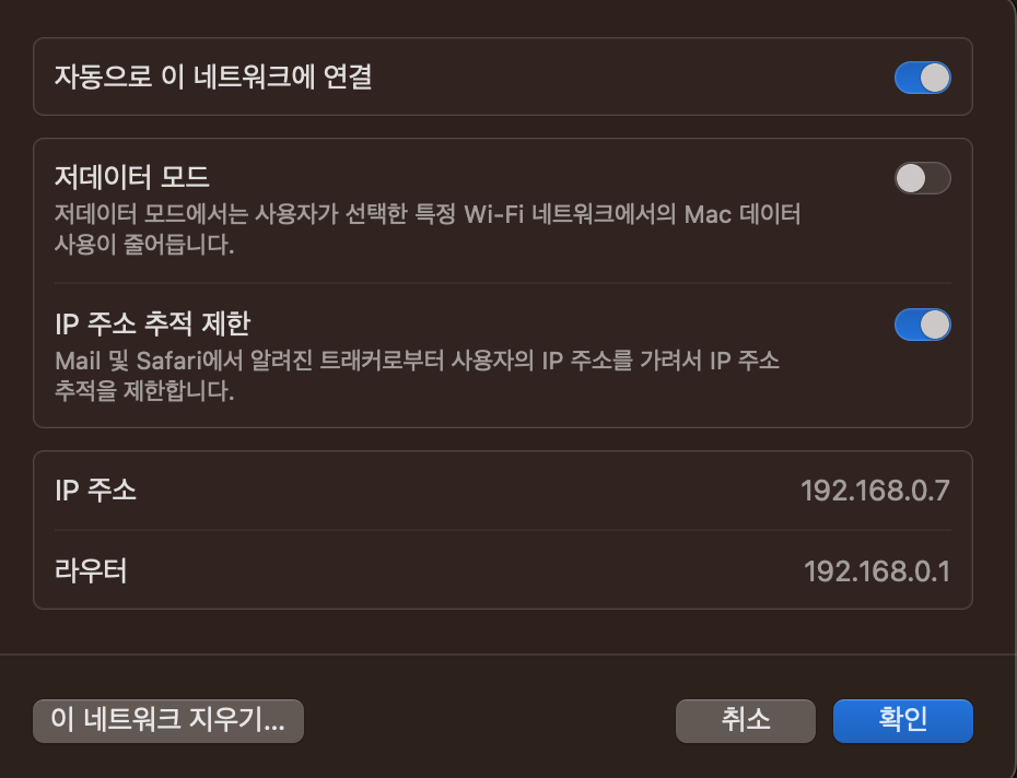 우리가 반응형 웹사이트를 제작할 때 모바일에서 어떤 식으로 화면에 보이는지 확인해야 할 필요가 있습니다. 그것을 배포 없이 손쉽게 확인하기 위해서 할 수 있는 방법 중 하나인데요. 로컬에서 개발 중인 내 화면을 모바일에서도 쉽게 확인할 수 있는 방법입니다. 모바일 기기에서 아래의 주소로 접속하면 됩니다. 모바일 접속 URL http://[IP주소]:[port주소] IP 확인 IP주소를 확인하고 싶다면 아래 방법을 참고하시면 됩니다. Window OS: https://www.tp-link.com/kr/support/faq/838/ 사이트 참고 Mac OS: 시스템 설정 → 네트워크 → 연결된 와이파이 우측 점 세개 아이콘 클릭해서 네트워크 설정 선택 → 아래 화면에서 IP 주소값 확인 만약 내가 개발하고 ..